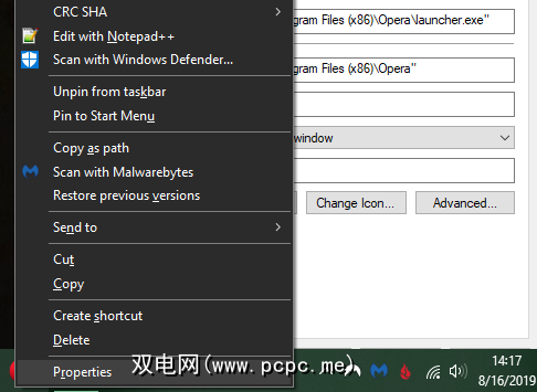 如果愿意,您可以自定义已固定在任务栏上的图标。按住 Shift 的同时,右键单击应用程序图标,然后选择属性。在这里,您可以按照上述相同的步骤来设置新图标。