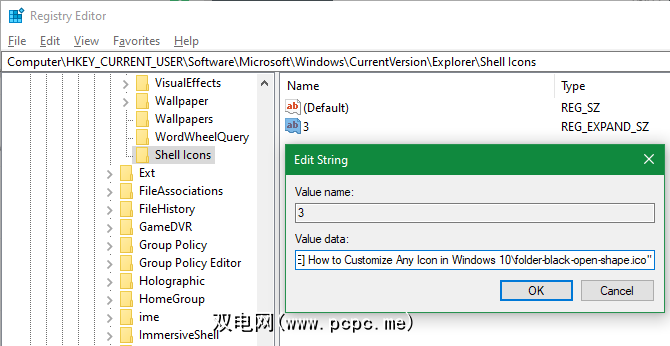 最后,双击刚创建的 3 字符串。在值数据字段中,用引号输入文件夹图标的位置。一种简单的方法是,在右键单击ICO文件的同时按住 Shift ,然后选择“复制为路径" 选项。