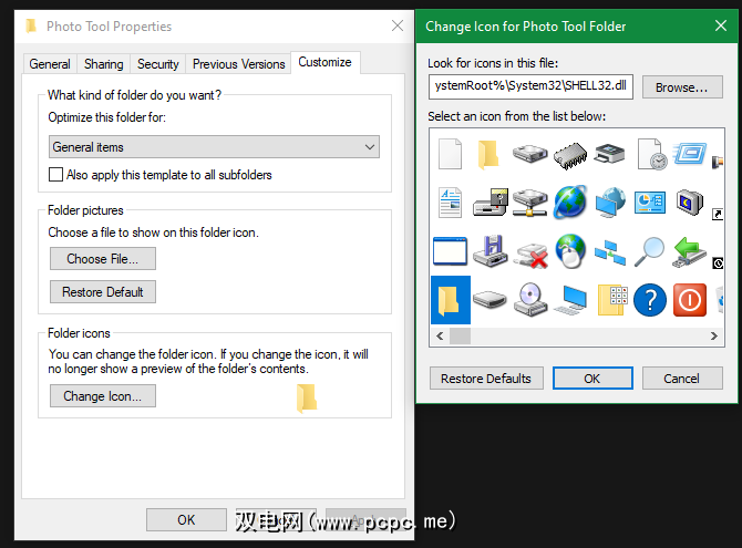 在出现的窗口中,切换到自定义标签。选择底部的更改图标按钮,以从计算机中选择一个新图标。 Windows为此提供了许多默认图标,但是其中大多数都是过时的和丑陋的。