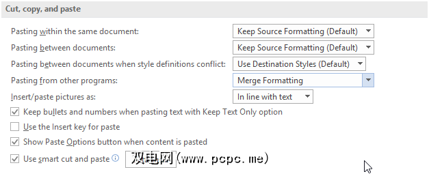 转到文件>选项>高级。在剪切,复制和粘贴下,您将看到五个选项: