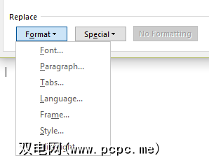 按< strong> CTRL + H 打开“查找和替换"工具。在右下角,您应该找到 Format ,这会打开一个下拉菜单。现在,您可以从其他替换字段的范围中进行选择。每个选项都会打开一个新的对话框,您可以在其中指定要替换的内容,将查找内容/替换为字段保留为空将更改所有匹配的格式。