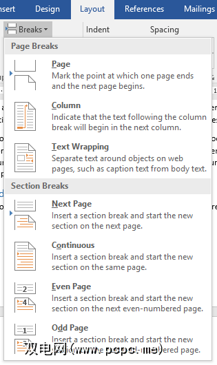 布局标签,然后选择断行。 ,它将打开一个包含各种选项的下拉菜单: