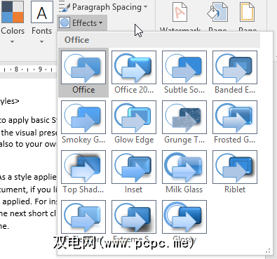 另一个方便但使用不足的工具是效果。就像选择主题会改变文本和格式的外观一样,选择效果也会改变整个文档中每个图像的外观。有常规Office,Glow Edge,Extreme Shadow等选项,还有更多其他功能,因此您可以选择与工作声音相匹配的选项。