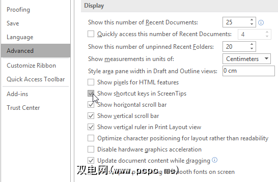 转到文件>选项>高级 >。在显示下,确保在屏幕提示中显示快捷键。 然后按 OK 。
