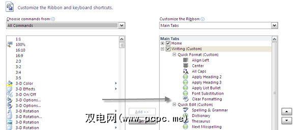 您无法更改功能区上的默认选项卡和组。但是,使用所有选择的命令添加自己的标签(和自己的组)非常容易。例如,您可能每天都要做一个任务。您可能希望点击次数尽可能少。使用常用命令自定义您的选项卡有助于您的工作流程。例如,我是作家和博客。