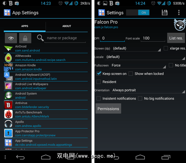 对于手机上的每个单独的应用,您可以指定许多按键设置。您可以通过更改屏幕设置在平板电脑或平板手机中运行它;强制它以全屏模式启动并隐藏状态栏;做到这一点,只要您使用该应用程序(可读性佳)等等,屏幕就永远不会关闭。