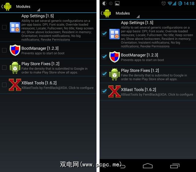 接下来,您将不得不选择一些要使用的模块。模块不会更改设备上的系统文件:它们的所有工作都在内存中完成,这意味着如果出现问题,您可以轻松禁用它们,而只需回到设备最初运行的方式即可无需还原任何备份。我是否提到过这个框架很棒?