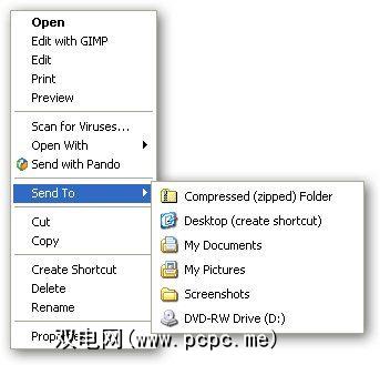 在这一点上,您可能在想“什么命令在哪里?"或“该命令有功能?"希望我们会按顺序为您回答这两个问题。首先,右键单击任何文件或文件夹。请注意,“上下文"菜单(即从光标下拉的菜单)具有多个选项。我们感兴趣的一个是“发送到"。将鼠标移到“发送到"命令上时,它会下拉并显示位置列表。