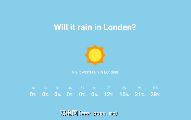 在移动或桌面浏览器上转到该网站。授予它访问您的位置的权限,或者您自己添加位置。在短短几秒钟内,Will It Rain会为您提供接下来10个小时的天气信息,告诉您降雨的可能性以及是否会晴天或阴天。