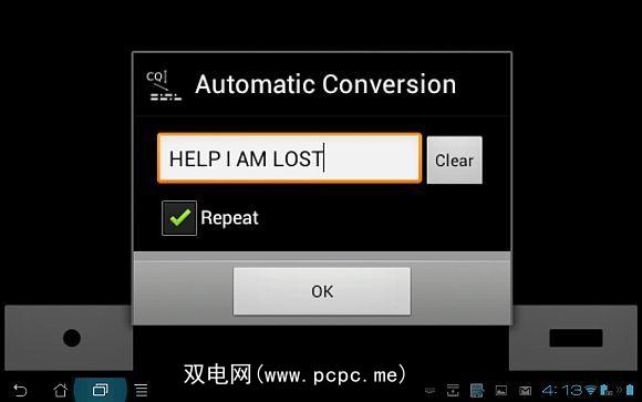 只需单击菜单按钮,然后点击“转换" 菜单按钮。通过此转换功能,您可以简单地键入要通过莫尔斯电码传输的邮件。如果您想让手机不断重复发送摩尔斯电码消息,请选择“ 重复"。