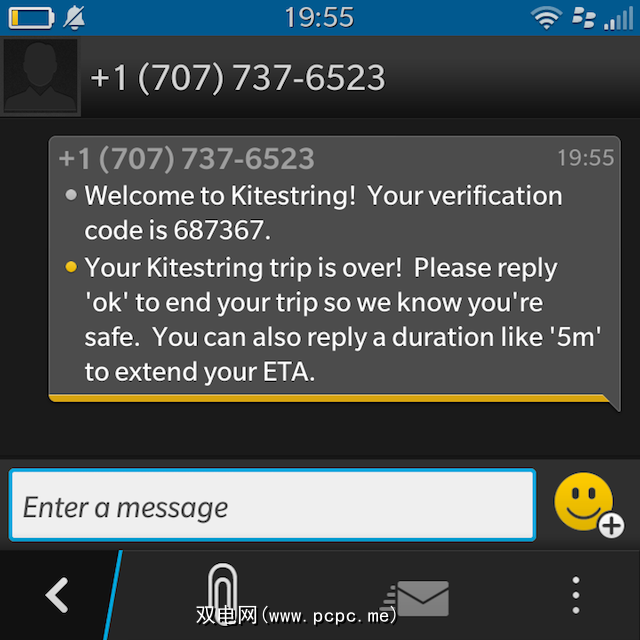该出发了!旅行时间结束后,您会从Kitestring收到一条短信,询问您是否回家。如果您仍在旅行中,则可以通过发回短信以延长旅行时间来延长旅行时间。例如,如果您要再出外30分钟,则可以选择“ 30m"作为响应,并且行程也会相应延长。
