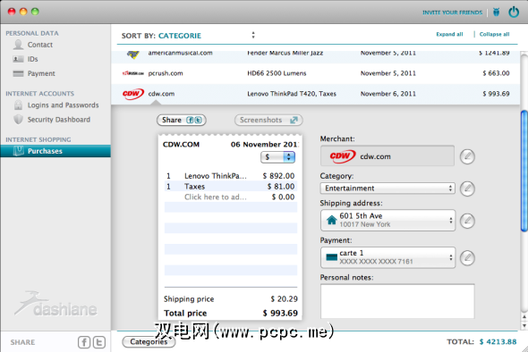 Dashlane保存您的购买收据,以便您以后查看。 Dashlane甚至保存了结帐流程的屏幕截图。