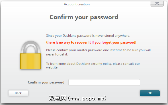 您的密码和其他个人数据将使用您提供的主密码进行加密。您必须记住该密码,否则将永远失去对数据的访问权限-Dashlane无法为您重置密码。这样甚至可以防止他们的员工访问您的个人数据。