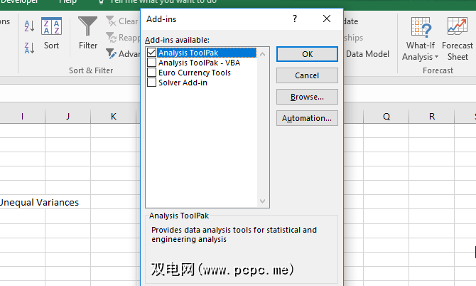 。在出现的窗口中,选中 Analysis Toolpak 旁边的框,然后单击确定。