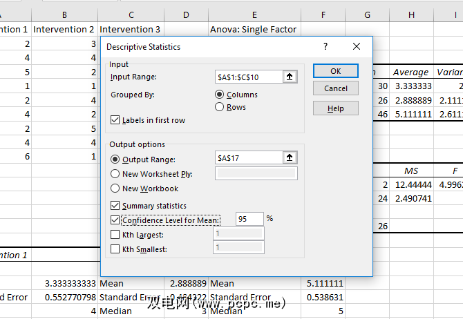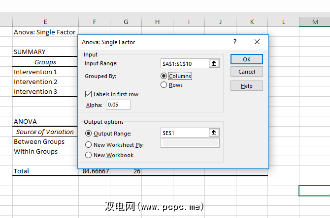 选择输入范围,并确保告诉Excel您的组是列还是行。我还选择了“第一行标签",以便在结果中显示组名。