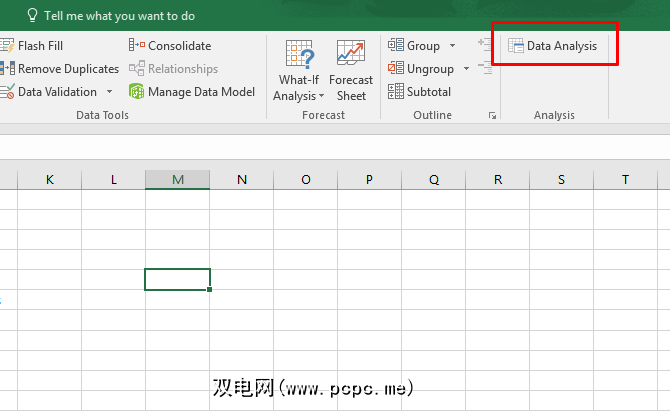 如果正确地将Data Analysis Toolpak添加到Excel中,您将在 Data 标签中看到一个 Data Analysis 按钮,该按钮分组为 Analysis 部分: