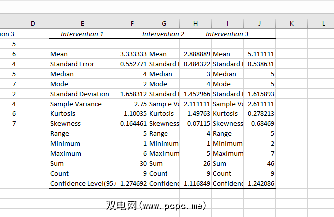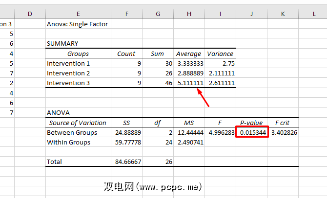 请注意,P值小于0.05,因此我们得到了显着结果。这意味着测试中的至少两个组之间存在显着差异。但是由于Excel不提供测试来确定哪些组不同,因此,您最好的办法就是查看摘要中显示的平均值。在我们的示例中,Intervention 3看起来像是可能有所不同。