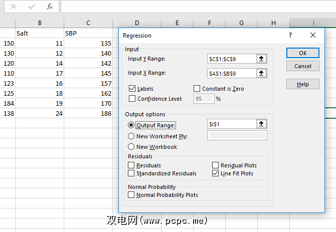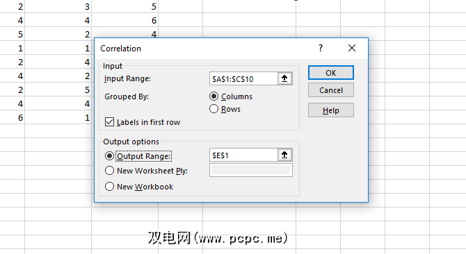 在那之后,请确保告诉Excel您的数据是否带有标签,是否要在新工作表中或在同一工作表上输出,以及是否需要摘要统计信息和其他选项。