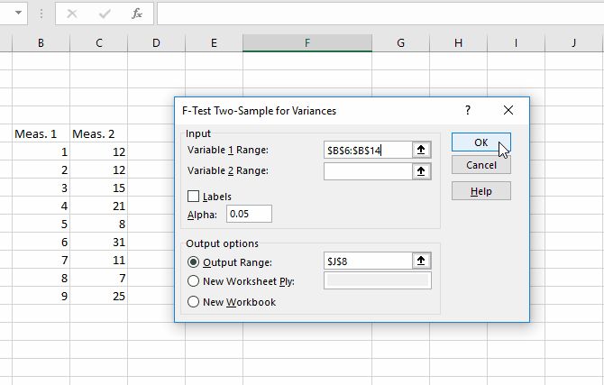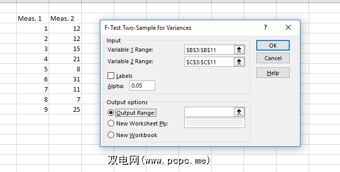 在输入范围框。除非有理由更改,否则将alpha值保留为0.05-如果您不知道这是什么意思,请离开。最后,单击确定。