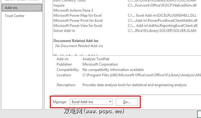 单击“管理:Excel加载项"旁边的 Go