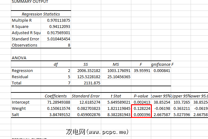 如您所见,体重的P值大于0.05,因此那里没有显着的关系。但是,盐的P值低于0.05,表明它是血压的良好预测指标。
