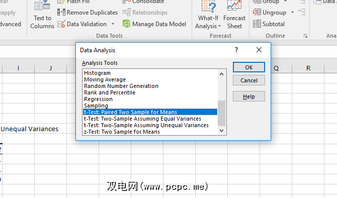 t -test是最基本的统计测试之一,使用Toolpak在Excel中进行计算很容易。单击数据分析按钮并向下滚动,直到看到 t -test选项。