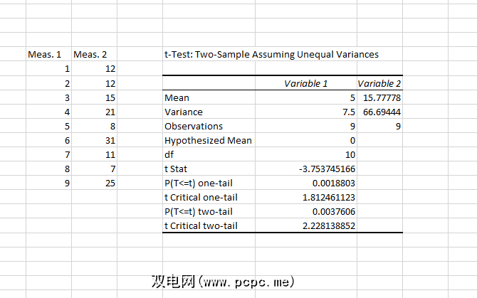 结果包括您需要报告 t 测试的所有内容:均值,一尾检验和二尾检验的自由度(df),t统计量和P值。如果P值小于0.05,则这两个样本会显着不同。