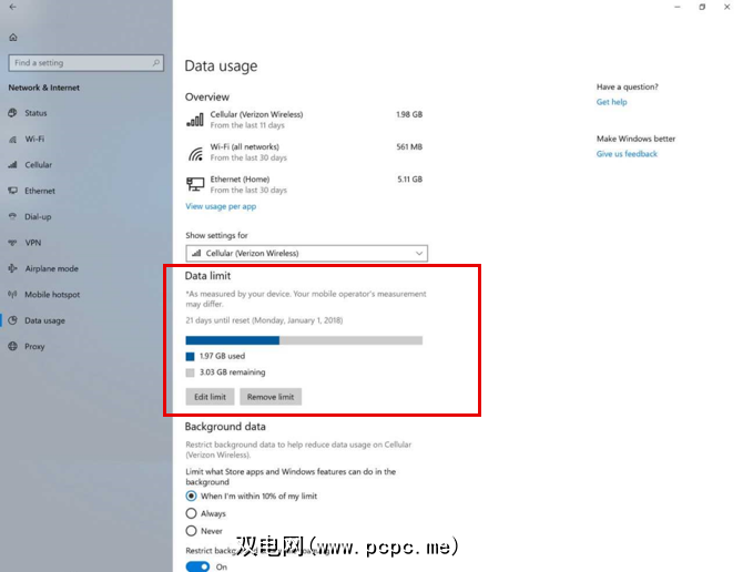 在计量连接中,ISP按使用的数据收费:您有特定数量的数据,必须购买更多数据如果达到极限。数据使用限制使您可以监视正在使用的数据量,从而可以在计量连接时推迟带宽密集型任务。