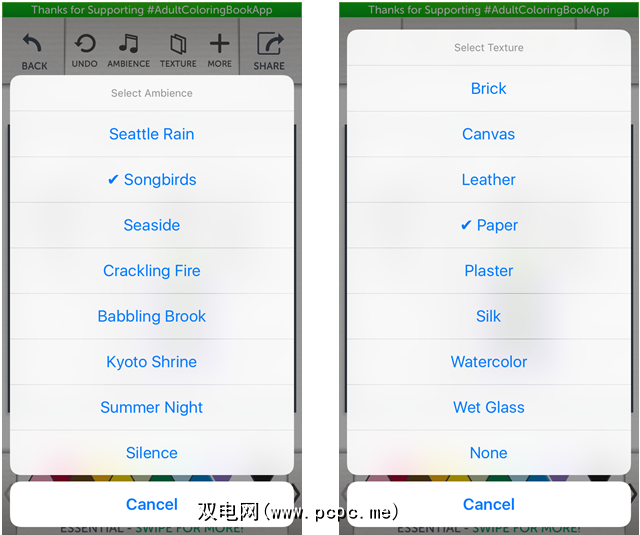《成人图画书》还具有其他一些值得注意的功能。您可以在着色时选择放松的氛围,并从诸如鸣禽、,小溪或海边等选项中进行选择。您也可以在着色时(或完成后)在您的图片上应用纹理。从砖块到丝绸再到水彩画,这些都可以使您的艺术品具有特殊的外观。另一个值得注意的功能是动画选项-只需点按即可查看动画版本,该动画版本显示了您如何为出色的杰作着色。