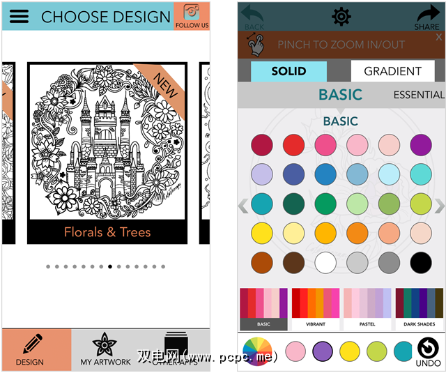 颜料提供了一个大型图像库,其中包含几何设计,有机图案,3D结构以及蝴蝶和动物等基础知识。该应用程序共有19个调色板,可让您调整所选每种颜色的阴影,这是一个不错的选择。