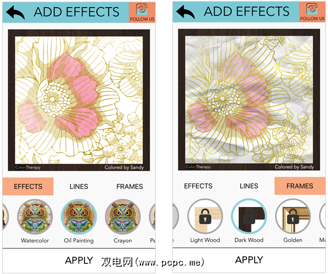 除背景音乐选择之外,使色彩疗法脱颖而出的原因是什么,是可以应用于完成的图片的效果。您可以添加一个简单的框架,从水彩,木纹或织物过滤器中选择。然后,您可以直接从应用程序将创建的内容共享到社交媒体,文本,电子邮件,或者将其保存到设备中。