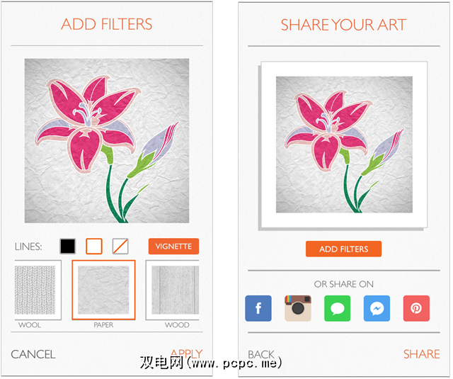 此应用程序提供的过滤器是让它脱颖而出的原因。您可以选择以白色或黑色显示线条,或将其完全从图稿中删除。然后应用诸如牛仔裤,皮革或羊毛之类的整洁效果,以获得额外的独特外观。