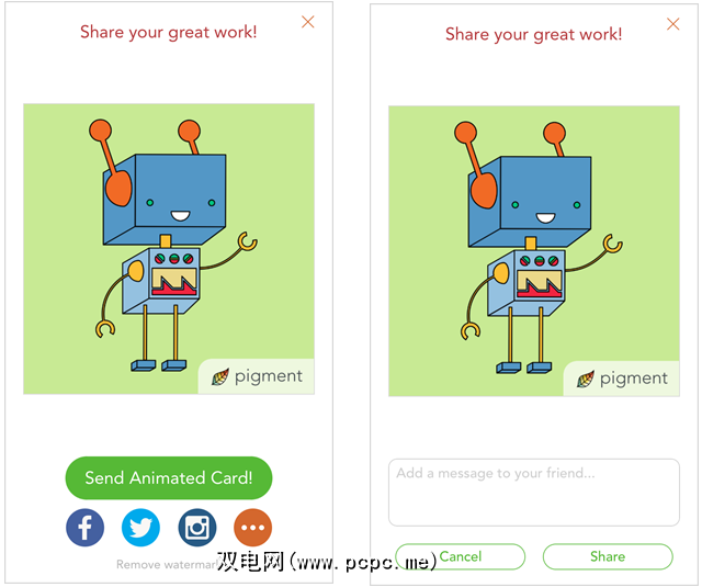与其他应用程序一样,Pigment可让您通过社交媒体,文本或其他方式共享创作电子邮件。但是,此应用程序更进一步,可让您共享动画卡。如果选择此选项,将创建一个链接供您共享,您可以将其发送给朋友。然后他们将看到一个动画,显示您如何为图片着色。