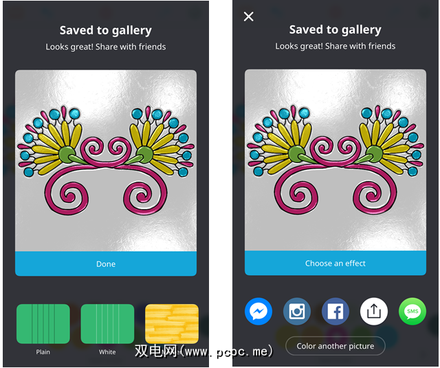 杰作完成后,您可以将其保存到设备中。或者,您可以在应用程序内将其共享到社交媒体,也可以通过文本或电子邮件发送。此应用程序的一个突出功能是您可以扫描自己的图像以从库中对其进行着色或打开。