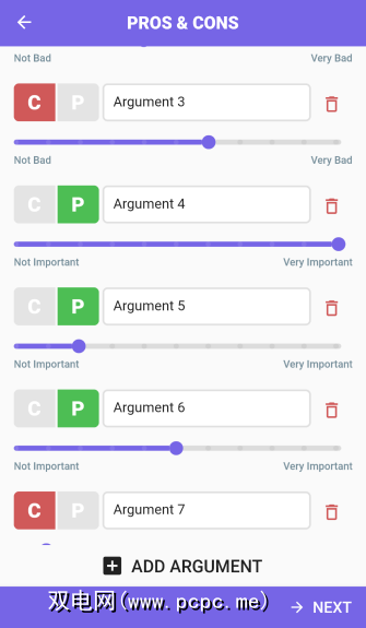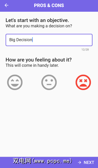 创建一个您正在苦苦挣扎的新决策,并根据表情符号。然后,您只需开始添加优点和缺点,每个优点和缺点的评分都在10分制上。