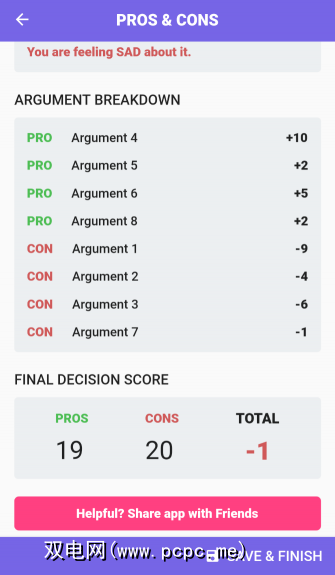 一旦您填补了可以想到的许多利弊,请转到下一步,该应用将计算结果。您会看到自己选择的内容,给予的权重以及优缺点的最终得分。一切就绪,您知道应该做出的决定。