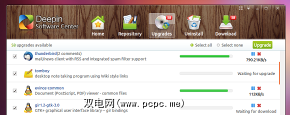 Deepin软件中心还可以根据需要为您处理更新软件。这可以在“ 更新"页面上找到。您可以手动选择要更新或更新的软件包,这完全由您决定。