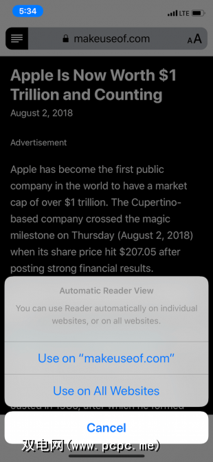 点击并按住 Reader View 按钮,您将看到两个新选项,可为当前网站或所有网站打开“自动阅读器视图"。下次您从网站上打开链接时,该链接将在Reader View中自动打开-无需再次单击该按钮!