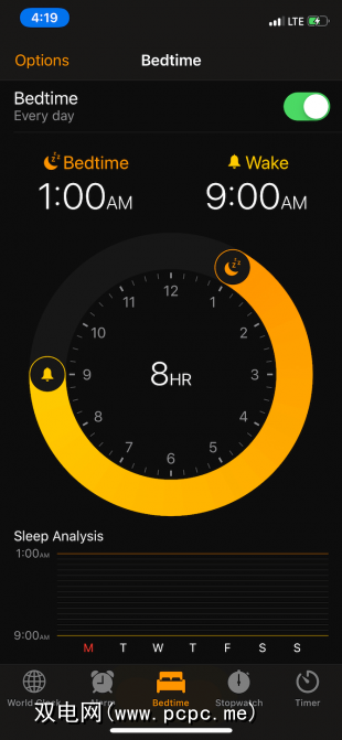下次打开“时钟"应用设置闹钟时,请点击中间的 Bedtime 部分。这个小功能可以帮助您在适当的时间上床睡觉。