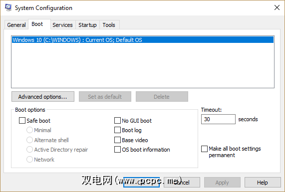 您可以使用“ Windows系统配置"窗口获得类似的结果。在“开始"菜单搜索栏中键入 mscon ,然后选择最匹配的匹配项。打开启动标签。您可以设置默认操作系统,超时屏幕和其他引导选项。