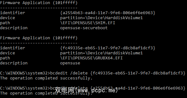 有些Ubuntu和openSUSE条目不再使用。复制要删除的固件条目的标识符,然后运行以下命令 bcdedit / delete {identifier} 。