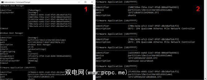 要删除旧的EFI条目,请打开提升的命令提示符,键入 bcdedit /枚举固件,然后按Enter。与用于Windows引导管理器的命令不同,“枚举固件"命令列出了BCD存储中所有可用的对象,包括所有Linux安装。下图显示了我的笔记本电脑固件列表: