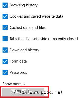 标记所有要删除数据旁边的复选框。要清除浏览历史记录,请确保选中关联的框。要查看更多选择,请展开显示更多下拉菜单。准备就绪后,选择清除。