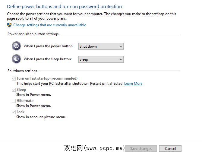 在结果菜单上,单击更改设置当前不可用文本,因此您可以进行更改。然后在电源菜单上选中休眠框以启用它。