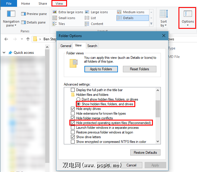 但是,必须先更改一些文件夹设置,然后才能看到它。打开“文件资源管理器"窗口,然后选择查看标签,然后选择选项按钮。在出现的窗口中选择查看标签,然后您需要选择两个选项: