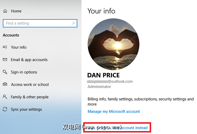 下一步,导航到帐户页面。进入该页面后,请确保您位于您的信息标签上。在这里,您将看到在您的名字下方使用本地帐户登录的选项。