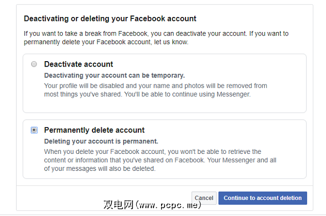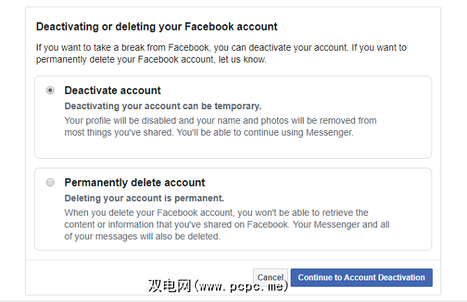 Facebook提供了两种方法来删除您的帐户和个人资料:通过停用它或删除您的帐户