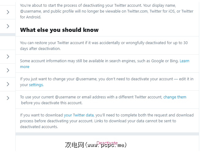Twitter随后将带您进入确认菜单。要确认您要删除或停用Twitter帐户,请单击停用。