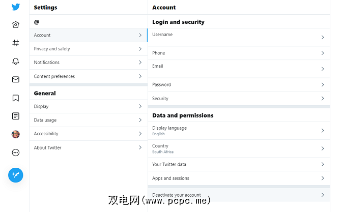 要删除您的Twitter帐户,请单击Twitter主页左侧带有三个点的菜单图标,然后选择设置和隐私 >选项。在此页面的底部,您将看到停用帐户的选项。