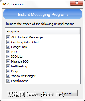 对于IM和文件共享程序,您可以选择Browser Cleaner清除的程序。这是一个设置列表,如果您使用的程序未出现在列表中,并且缺少某些名称,则无法添加到列表中。